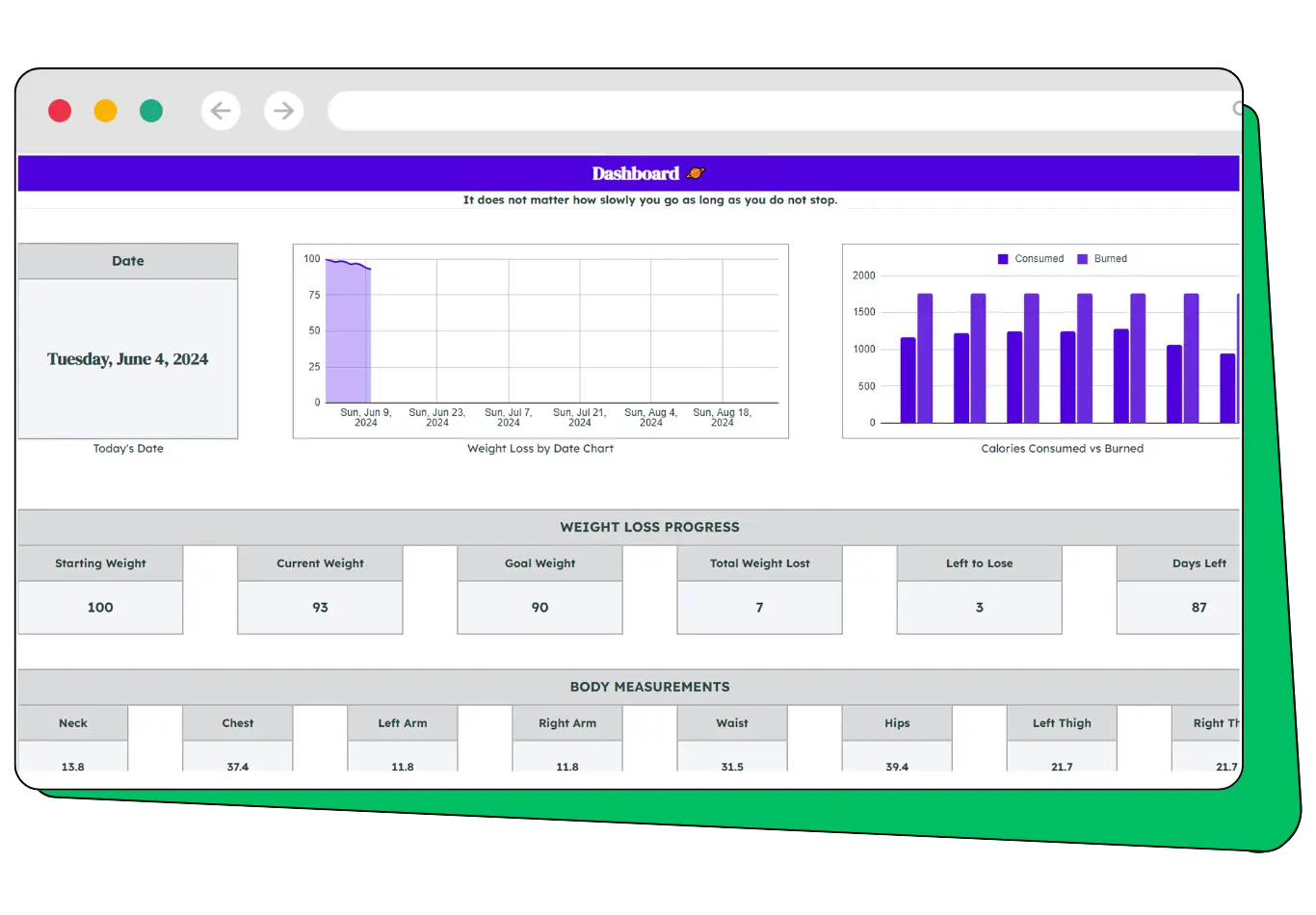 Record daily weight, workouts, calorie intake, and habit completion.