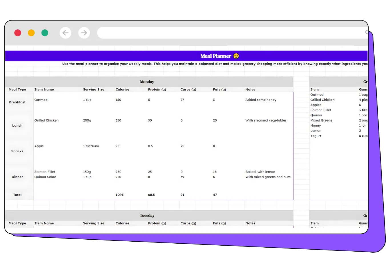 The Diet Planner is a practical tool that helps you organize your meals on a weekly basis, ensuring you maintain a balanced diet and streamline your grocery shopping.