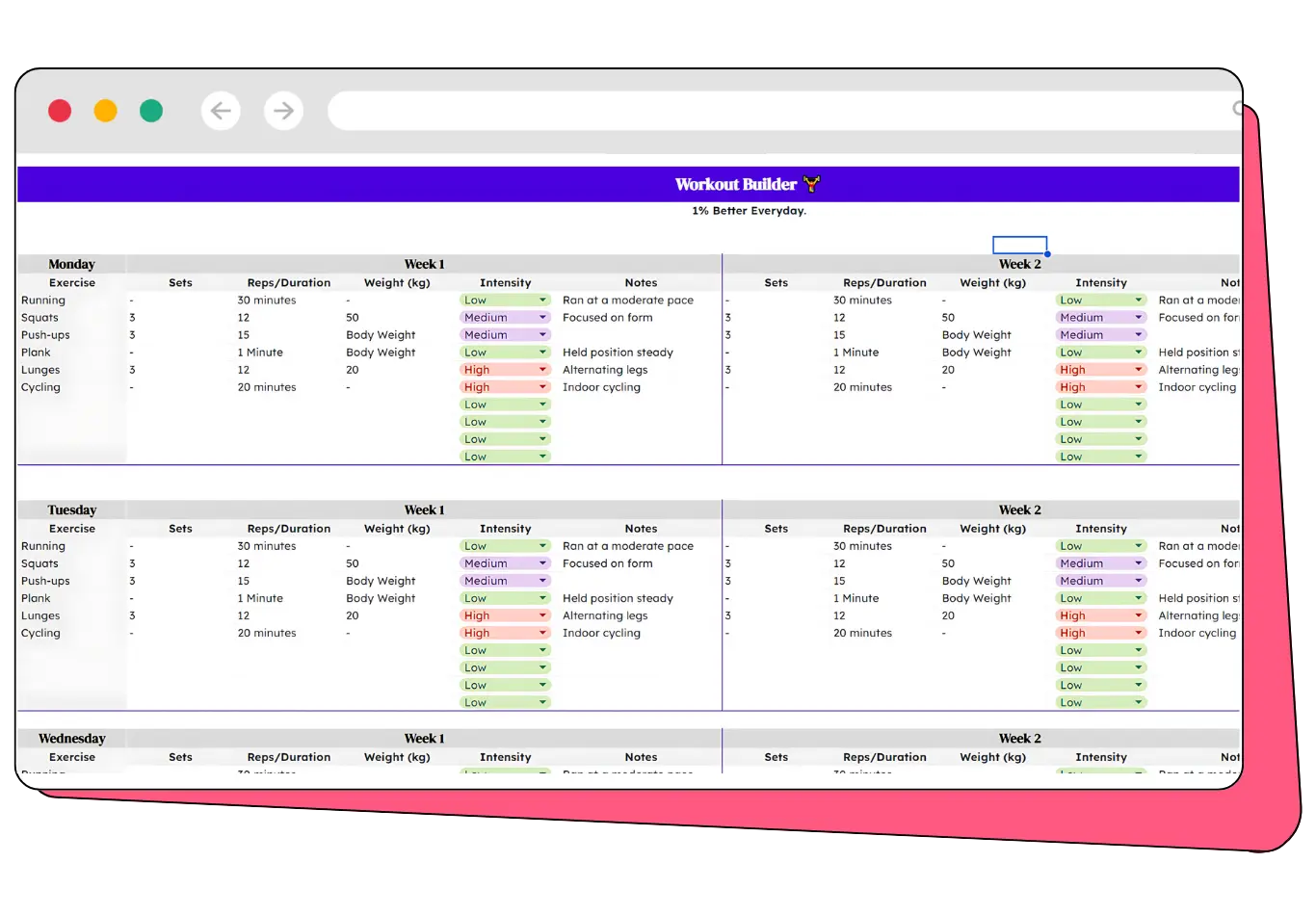 Track your workouts for up to 5 weeks, with the option to expand as needed. The workouts are organized by days to maintain clarity and prevent mix-ups.